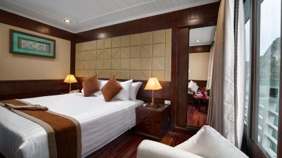 Located on the first floor with connecting rooms and panorama windows overlooked the sea, you can see and feel the real wonderful Halong Bay. This cabin is good choice for small group or family with children. You also have free special offer as below: Fruits basket & Bottle of house wine.